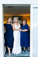 A few months later, after various iterations of Covid wedding plans, they chose to have a simple and elegant elopement out in Barnstable. Kelsey and her mom planned all the details, from flowers to table arrangements to their dog's hot pink mohawk. The couple exchanged vows on the back deck in front of a lake, surrounded by immediate family and friends.